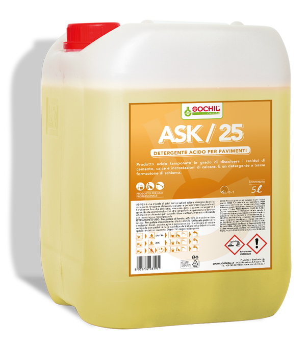 Detergente disincrostante molto attivo a base di acido e tensioattivi. Efficace per l'eliminazione di incrostazioni calcaree e veli di cementai pavimenti, sanitari, spogliatoi, officine, terrazze e parti di piscine.